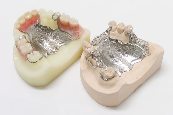 金属床義歯は、義歯の主要部分に金属を使用することで、強度と薄さを両立した義歯です。熱伝導性にも優れているため、食べ物の温度が伝わりやすく、食事の楽しみを損ないません。また、変形が少なく、長期間安定して使用できるのも大きな特長です。特に装着感を重視したい方に適しています。