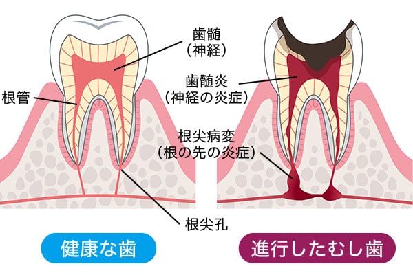 歯の中には神経や血管が束になった「歯髄(しずい)」という組織があり、むし歯の進行や外傷などでこの歯髄が細菌感染すると、炎症や痛みが生じ、最悪の場合は抜歯という選択が必要になります。この感染した歯髄を除去し、内部を無菌的に清掃・消毒して密閉する治療が「根管治療」です。